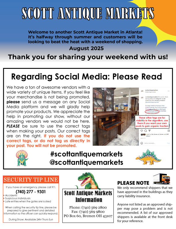 Flyer for Scott Antique Markets in Atlanta, August 2025, with information on social media guidelines, security tips, and contact details.